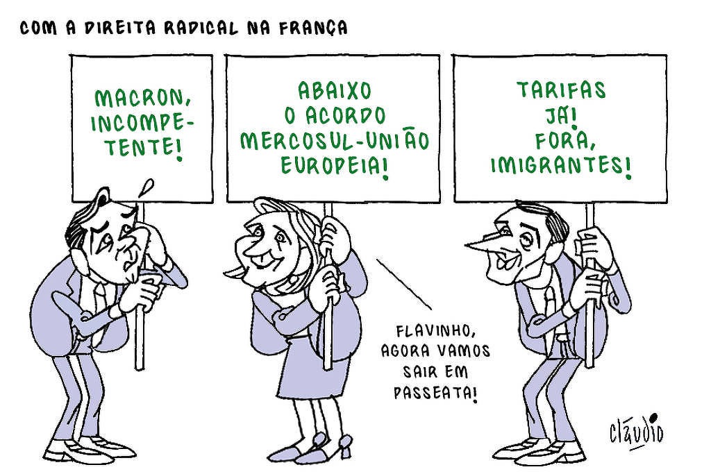 Flávio Bolsonaro se junta à ultradireita francesa. Candidato do PL chamou o presidente da França, Emmanuel Macron, de incompetente. O traço é do inconfundível Cláudio Oliveira,