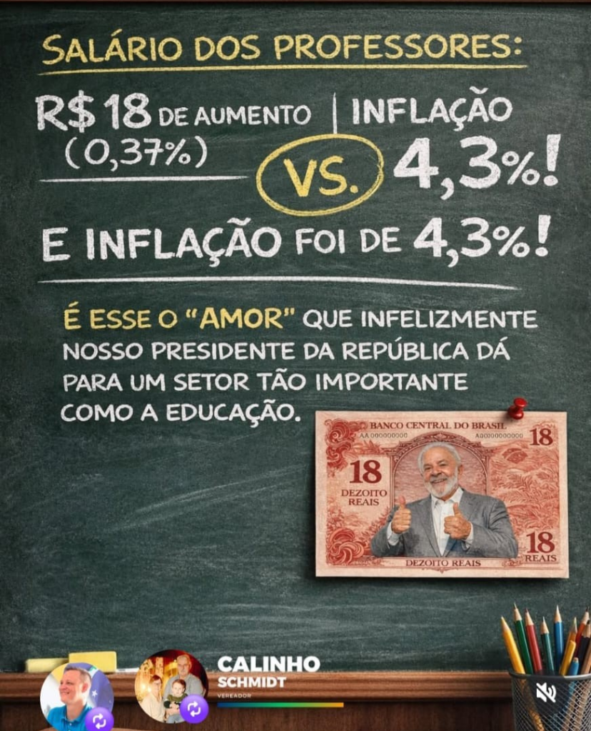 Os vereadores sabem muito bem o que estão fazendo. Tanto que o bolsonarista Carlos Eduardo Schmidt Sobrinho, PL, foi às redes sociais se indignar contra o vexaminoso reajuste dos professores concedido pelo governo de Luiz Inácio Lula da Silva, PT. Fez bem. Até desenhou para que não houvesse dúvida e reproduzo acima, o meme que ele criou para as redes sociais dele. Calinho, como gosta de ser chamado, com isso, por exemplo, sabe – ou deveria saber – que beira ao pornográfico, o aumento de 34 a 61 por cento nas diárias dos vereadores, e dos servidores da Câmara de Gaspar como determinou no canetaço, de uma só vez, a Resolução 01/2026, do presidente Ciro André Quintino, MDB.