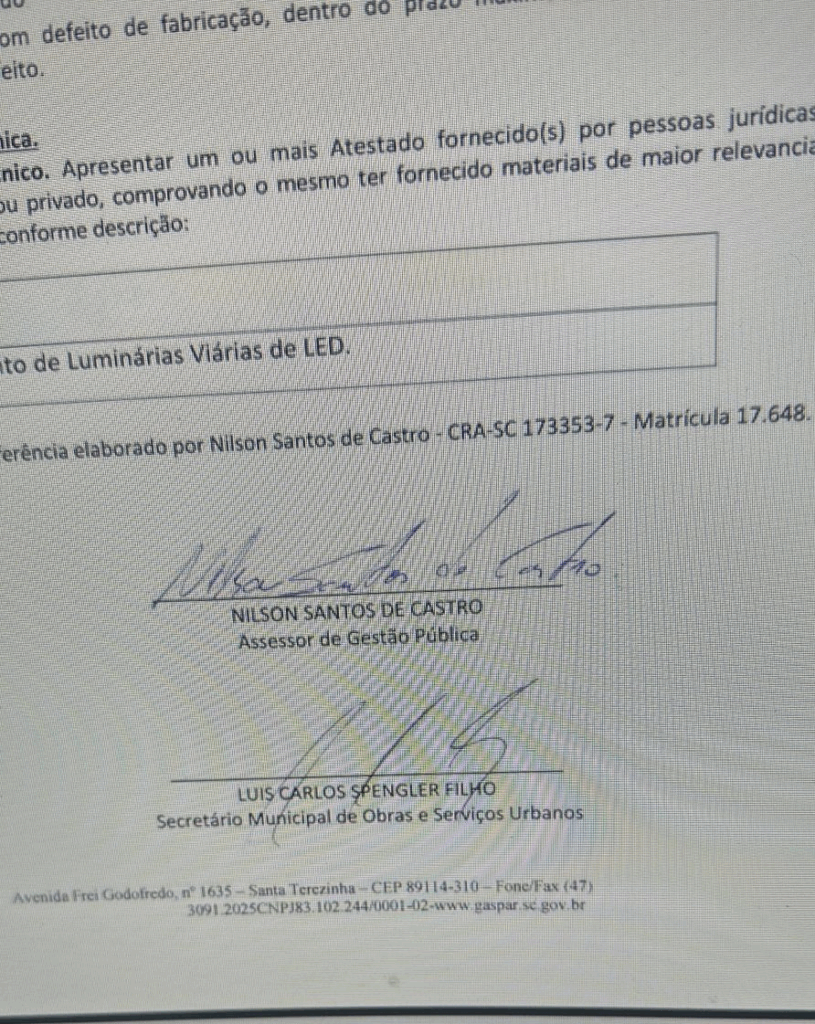 A licitação por registo de preço, pregão presencial 92/2022 em Gaspar, no processo administrativo 168/2022, aconteceu as 9h30min do dia 29.08.2022. Ele pode ser acessado no site da prefeitura. O secretário de Obras e Serviços Urbanos era o ex-vice-prefeito de Kleber Edson Wan Dall, MDB, no primeiro mandato e então presidente do PP, Luiz Carlos Spengler Filho.