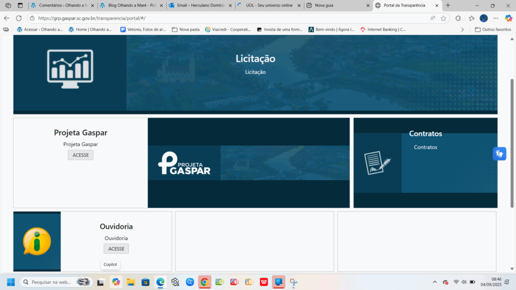 Exagero, mais uma vez, como sempre me culpam e me tenta constranger por várias formas? Então  compare com o site daqui. Tente acessar o Portal da Transparência. Tente saber dos números do Orçamento, dos repasses ao Fundo Municipal de Saúde e dele ao Hospital de Gaspar. Tudo isso, deveria ser um espelho diário da contabilidade, como é na maioria dos municípios catarinenses, como é no governo do Estado, como é com o governo brasileiro. É a prestação de contas aos que pagam os pesados impostos, cada vez mais altos e cobrados em tempo real.