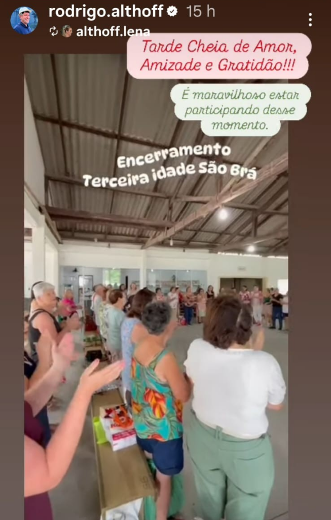 O recado. O vice-prefeito de Gaspar, o jovem Rodrigo Boeing Althoff, Republicanos – era do PL até outro dia – é engenheiro civil, é construtor, foi secretário de Planejamento, possui vasto conhecimento acadêmico nesta área do Plano Diretor, segundo o currículo dele e ele próprio anunciava por aí nas campanhas de 2020 e 2024. Rodrigo estava ausente do lançamento. Estava (foto ao lado) num evento de encerramento de idosos na Comunidade São Brás, na Lagoa, onde mora.