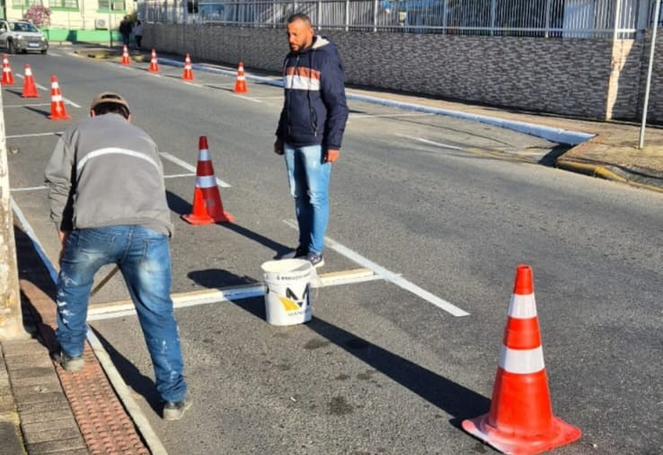 Há máquinas, equipamentos e gabaritos específicos. Mas, em Gaspar, a medição e pintura das vagas de estacionamento rotativo são marcadas com trenas, barbantes e pincel (foto ao lado). Pelo jeito e tempo, quando terminarem todas as marcações e pinturas, a mesma equipe terá que recomeçar o serviço no mesmo ponto do início.