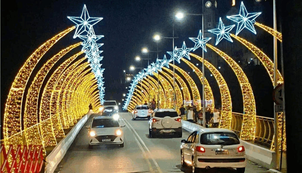 A iluminação natalina de Gaspar, finalmente, voltou a ter vida, mas não tão própria, assim como deveria ser. Na ponte Hercílio Deecke, por exemplo, ela imita a da ponte Adolfo Konder, no Centro de Blumenau. Até nisso somos uma sucursal de lá. O registro fotográfico daqui é de Jadir Amorim.